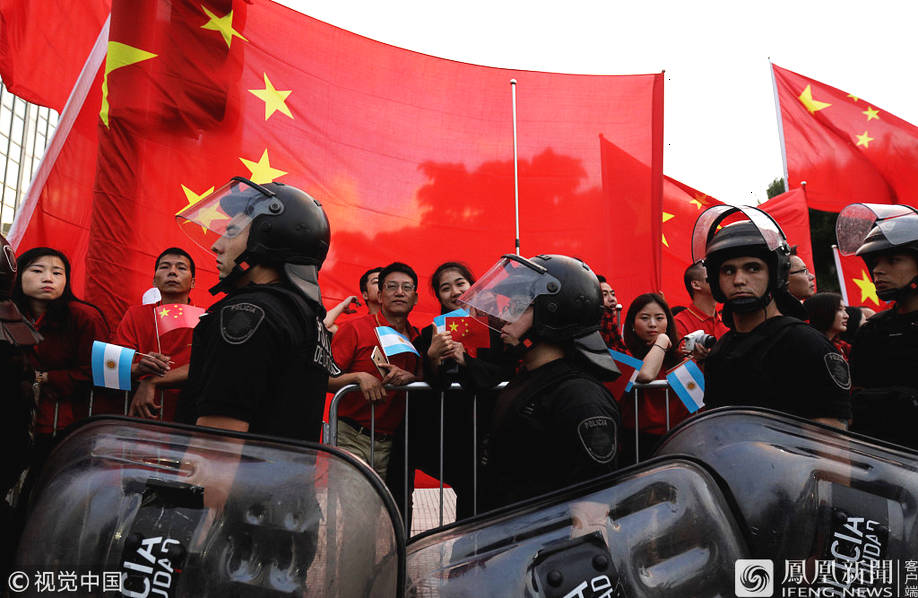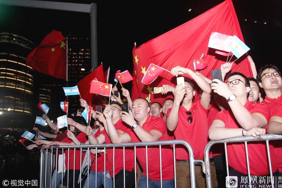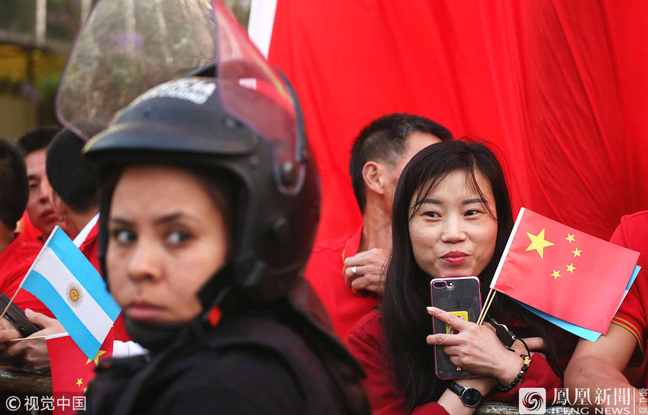 阿根廷的华人华侨挥舞中阿两国国旗,热烈欢迎习近平一行。