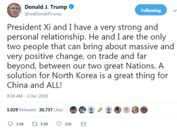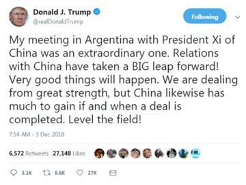 美国总统特朗普于12月3日上午连发三条推特,对与中国国家主席习近平在阿根廷的会晤进行评价。