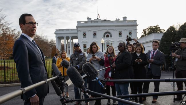 美国财政部长姆努钦2018年12月3日在白宫对记者谈论对中共贸易谈判。