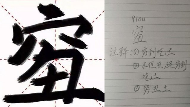 《现代快报》报道,“2018年度汉字”前晚已登上微博热搜榜,此字由“穷”字与“丑”字结合,可解作(1)穷到吃土;(2)不但丑还穷到吃土;3.穷丑土!而穷(qiong)加丑(chou)的读音,就是糗(qiou),所以这个字的读音是“糗”。