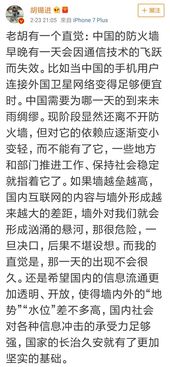 环球时报总编辑胡锡进在事后发微博评论,「中国的防火牆早晚有一天会因通信技术的飞跃而失效。比如当中国的手机用户连接外国卫星网络变得足够便宜时。中国需要为那一天的到来未雨绸缪。现阶段显然还离不开防火牆,但对它的依赖应逐渐变小变轻,而不能有了它,一些地方和部门推进工作、保持社会稳定就指著它了…而我的直觉是,那一天的出现不会很久…」