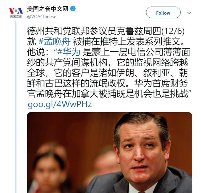 华为首席财务官(CFO)孟晚舟在加拿大被捕的消息传出之后,德州共和党联邦参议员克鲁兹周四在推特上发表推文,指出“她在美国面对的将是中国所没有的:公平、公正的司法系统”。