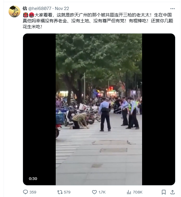 这就是昨天广州的那个被共匪连开三枪的老太太!生在中国真他妈幸福没有养老金、没有土地、没有尊严但有党!有棍棒吃!还赏你几颗花生米吃!