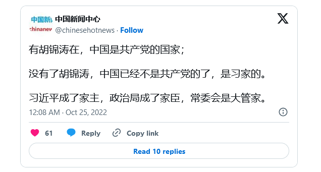 2022年末习近平中共二十大报告中,最明显的是,报告全文多达91次提到“安全”二字,相对之下胡锦涛卸任时的十八大报告,仅36次提及安全。而习最忧心的个人安全或称习政权的安全重担,首先交给了蔡奇