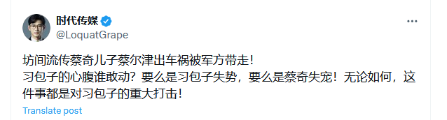 他表示,如果习近平失去权力,那么蔡奇就得失去权力,中央办公厅主任就要换人。“现在突然传出消息指蔡奇的儿子蔡尔津被中纪委带走。也有时事博主发消息称,蔡奇的儿子遭遇车祸,实际上是被‘暗杀’,之后不是被送到医院,而是被中纪委带走调查。”