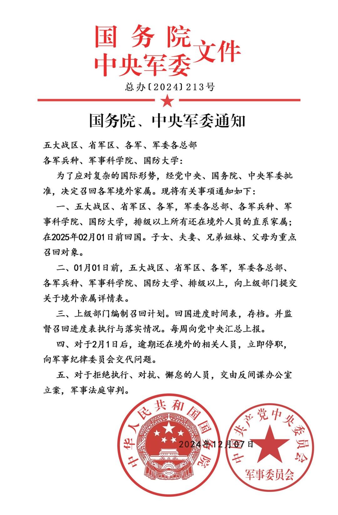 一、五大战区、省军区、各军,军委各总部、各军兵种、军 事科学院、国防大学,排级以上所有还在境外人员的直系家属; 在2025年02月01日前回国。子女、夫妻、兄弟姐妹、父母为重点 召回对象。