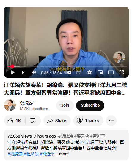 声称前国家主席胡锦涛及现任军委副主席张又侠支持汪洋主导或出席一个定于9月3日的大阅兵活动。 -