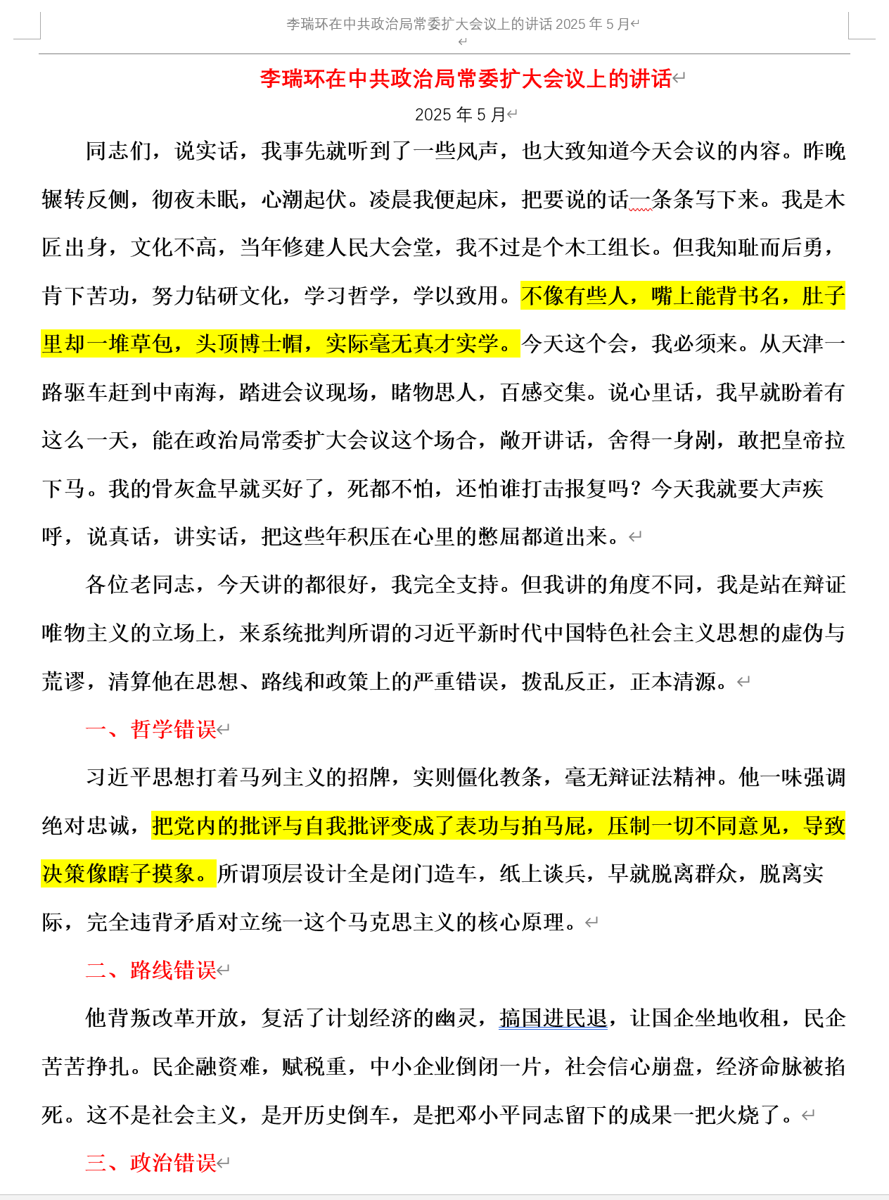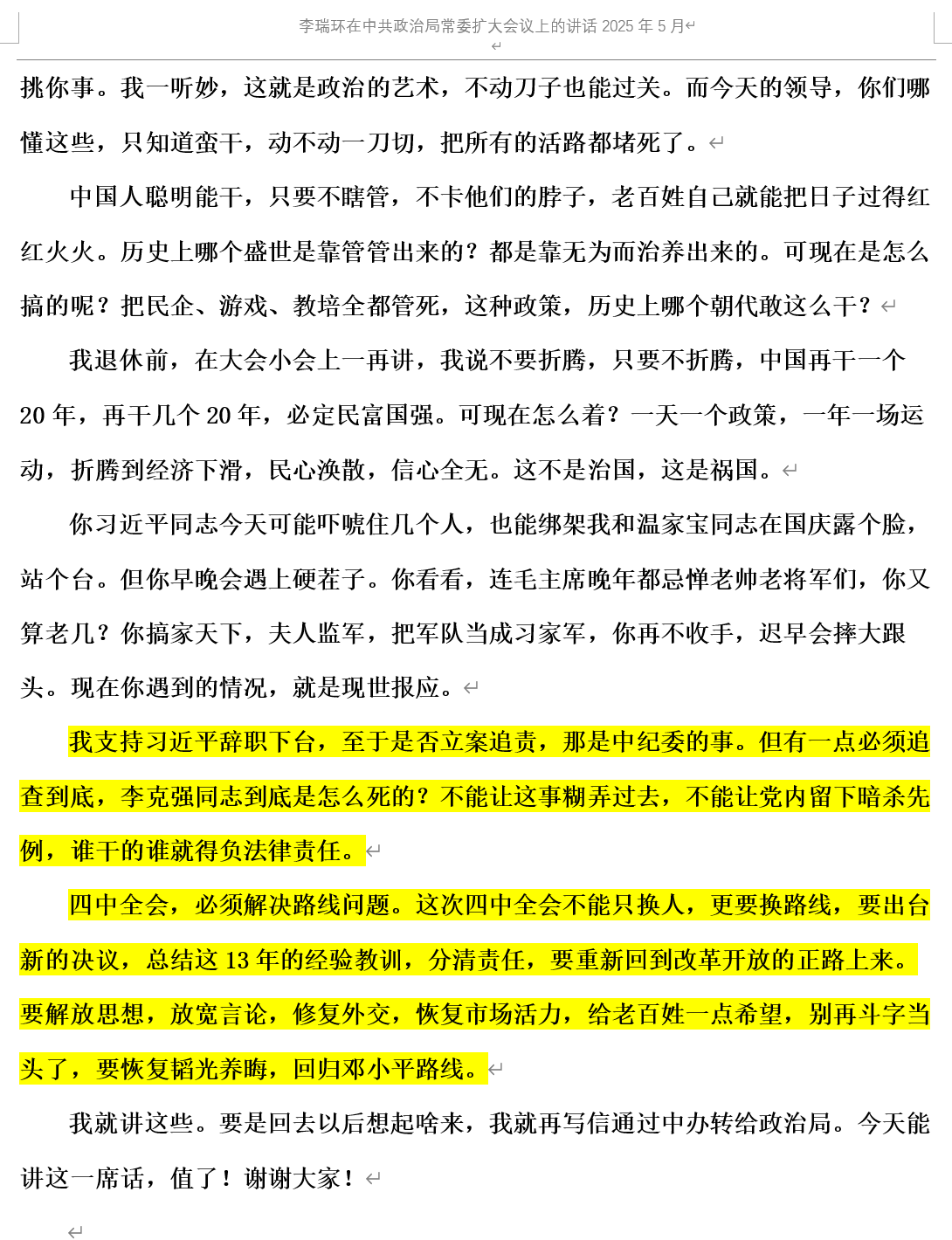 李瑞环政治局扩大会议讲话曝光,痛骂习近平愚蠢狂妄搞复辟,要求追查李克强死因法办相关人员