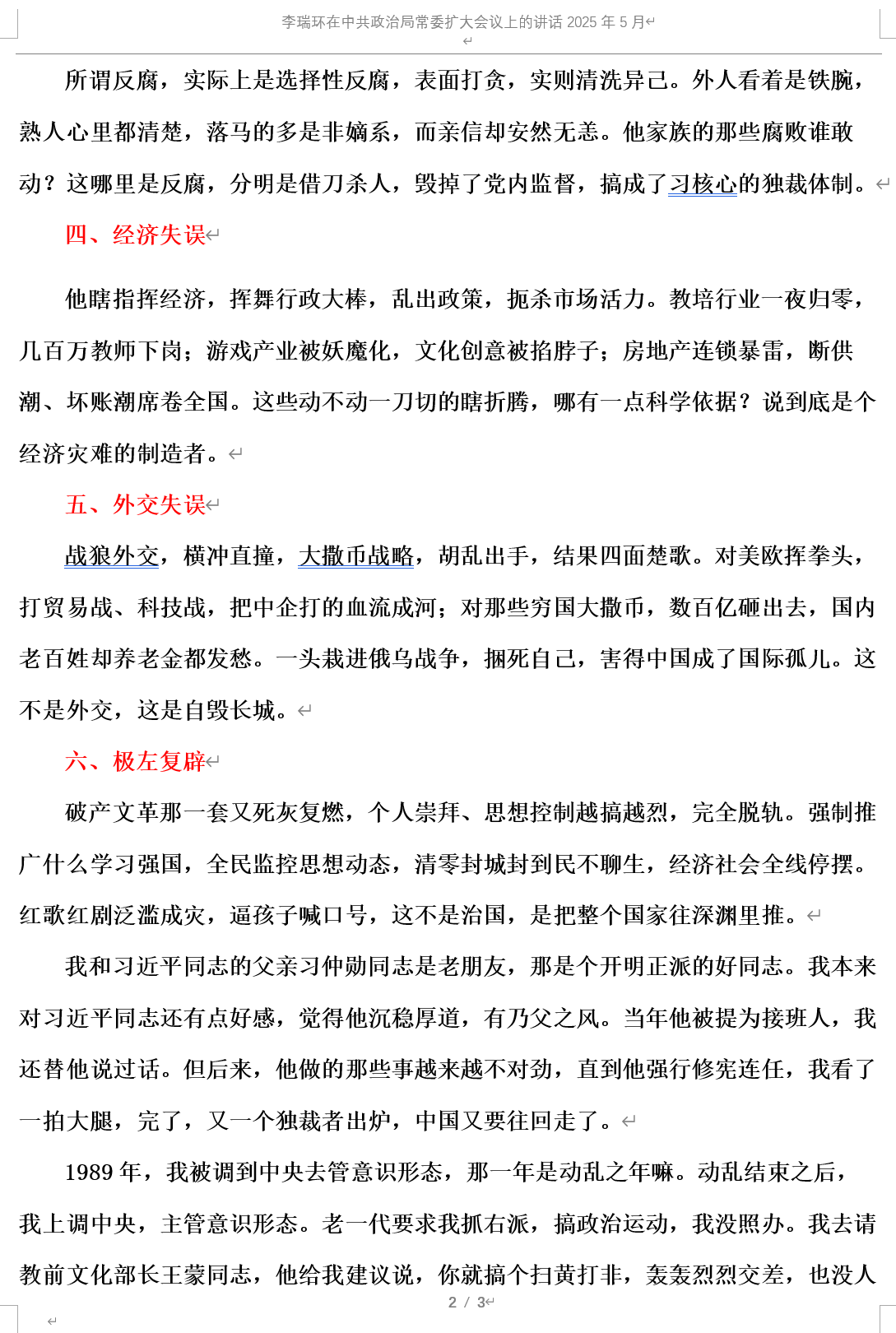 • 李瑞环政治局扩大会议讲话曝光,痛骂习近平愚蠢狂妄搞复辟,要求追查李克强死因法办相关人员