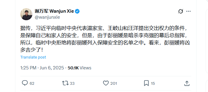 据传,习近平向临时中央代表温家宝、王岐山和汪洋提出交出权力的条件,是保障自己和家人的安全,但是,由于彭丽媛是暗杀李克强的幕后总指挥,所以,临时中央拒绝将彭丽媛列入保障安全的名单之中。看来,彭丽媛将凶多吉少了!