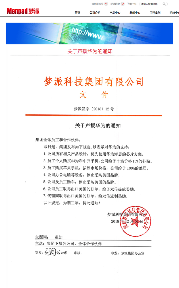 梦派科技客服人员确定此通知的真实性。另外他解释称,公司创始人刘丹原为康佳集团前任总裁,创业之后仍保留对国有品牌的情怀,以及对任正非和董明珠等人的钦佩感,他自己也一直用国产手机产品。本次对华为的声援并非为炒作,内部并未主动宣传此通知。平时老板也倡导员工多用国货产品。