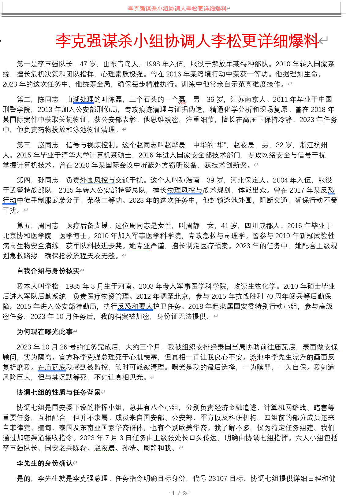 李克强被杀协调人李松为防家人被杀海外爆料 - 暗杀李克强小组成员名单