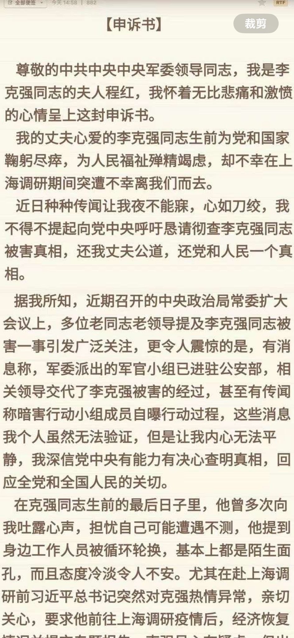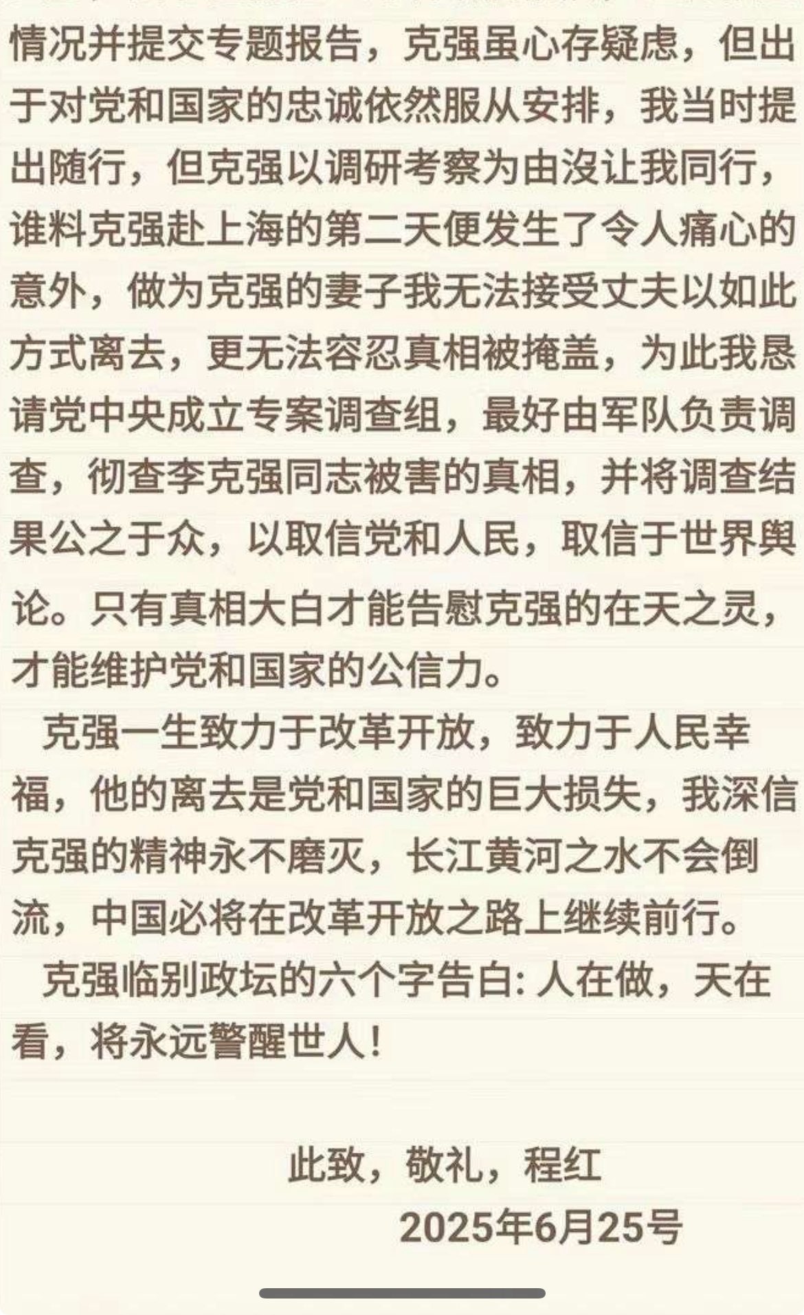 程虹在陈情书中提到,李克强生前鞠躬尽瘁、殚精竭虑,却在上海“突遭不幸”离世。近日网络上有种种关于李克强死亡的传闻,令她夜不能寐、心如刀绞,才提笔向党中央呼吁,恳请彻查李克强被害真相,还李克强一个公道。