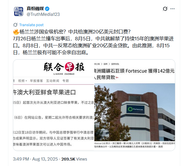 媒体人「大包王朝」节目中爆料,最早报杨兰兰是红三代的澳洲网友——Jonathan在其X平台公开表示遭到中共警察跨境威胁。按照中共操作惯例,不准的谣言中共不理会,凡是公安部管的,都是因为说对了。大包王朝分析:「杨兰兰与中铁集团的关系,以及她掌握澳洲铁矿石的分配权是真实的。」