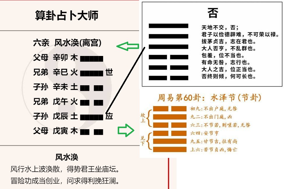 这一卦是风水涣卦,风水涣来自天地否卦,是天地无感应无交流极端阴暗之时。而这一卦的覆卦是节卦,交互卦是山雷颐卦。