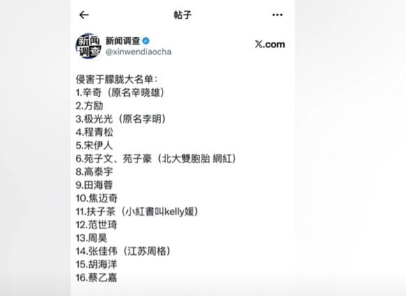 再看X平台新闻调查的帖子:「长文收藏:【死亡之局名单~太子爷辛奇】」,列出辛奇蔡奇私生子,聚会名单增至17人,他系主谋。