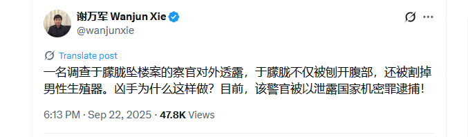 9月17日,X帐号“新闻调查”发布了一篇长贴文,他表示这是有关于朦胧案件的一个非常接近事实的分析,而这段文字在大陆已被全网封杀。