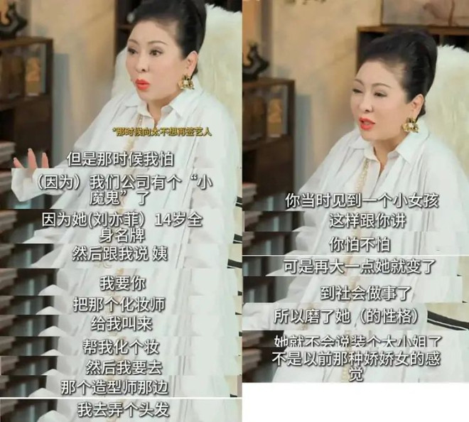 据向太透露,刘晓莉带着14岁的刘亦菲去找向太签约,当时向太和向华强成立的中国星集团,可以说是香港龙头娱乐公司,旗下有周星驰、李连杰、张柏芝这些顶流,还和王星等大咖均有合作,是很多新人挤破头都想去的大公司。