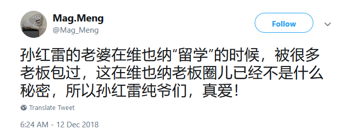 孙红雷的老婆王骏迪在维也纳“留学”的时候,被很多老板包过,真爱! 中国记忆 13 12 月, 2018 娱乐新闻 孙红雷的老婆在维也纳“留学”的时候,被很多老板包过,这在维也纳老板圈儿已经不是什么秘密,所以孙红雷纯爷们,真爱! 本文内容除特别注明外均取自各新闻媒体(本站底部列表)和youtuber twitter(x),chatgpt, gemini, 并不代表本站立场! 评论不允许人身攻击。 Posted in 娱乐新闻Tagged 孙红雷, 王骏迪, 维也纳Related Posts 丁嘉丽:我最后悔就是捧红了孙红雷这个“白眼狼” 孙红雷将面临30亿的赔偿?
