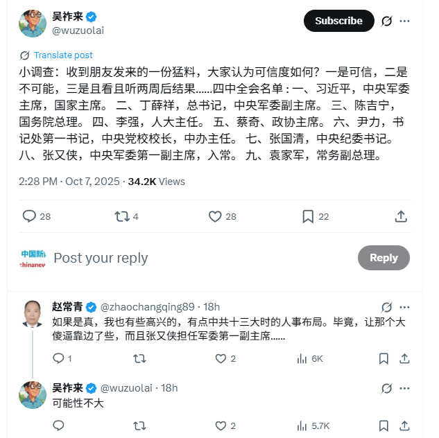 该贴文截至截取时显示约1.3万次查看,并引发大量转发与评论。帖文下方聚集大量即时反应,意见分裂明显:有人认为名单若属实,将导致中共权力格局出现重大调整;也有人断言不可信,质疑安排违反常规。