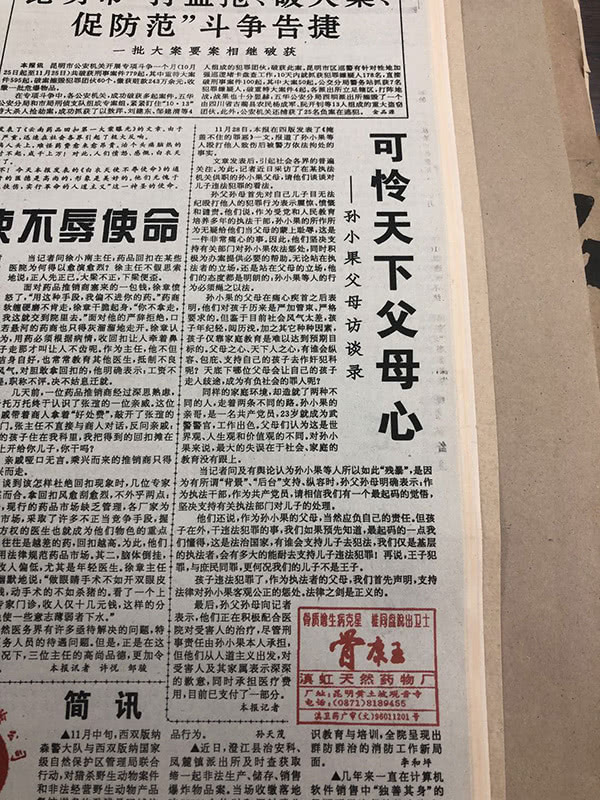 当时,昆明两家报纸对此案进行了报道,其中一家报纸在11月28日以特别的形式对案情作了详细报道,并以过人的胆识将矛头直指”孙小果的某些背景”。