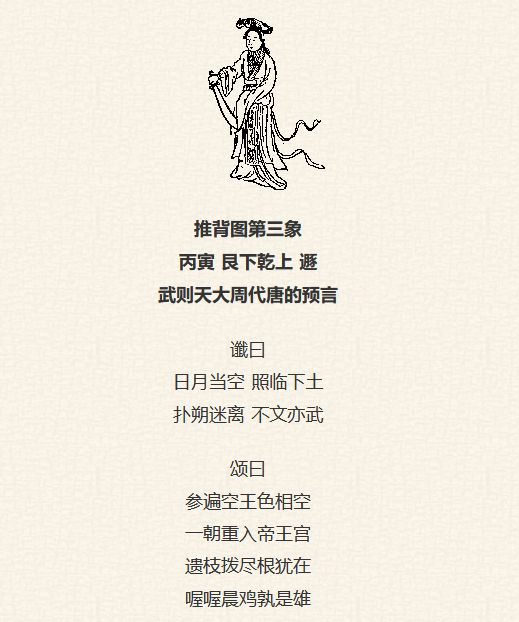 标题为:“丙寅,天山遁”,根据《推背图》的成书时间公元630年推算,本象应该说的是公园695年之后的事情,当时执政者正是武则天。