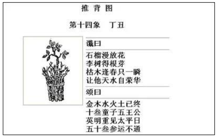 《推背图》的第十四象准确预言了后周的兴亡。第十四象的图中画了一捆柴,柴上面长出一枝新芽。”柴”暗指周世宗柴荣父子,新芽指赵匡胤,暗示赵氏宋朝代替后周。