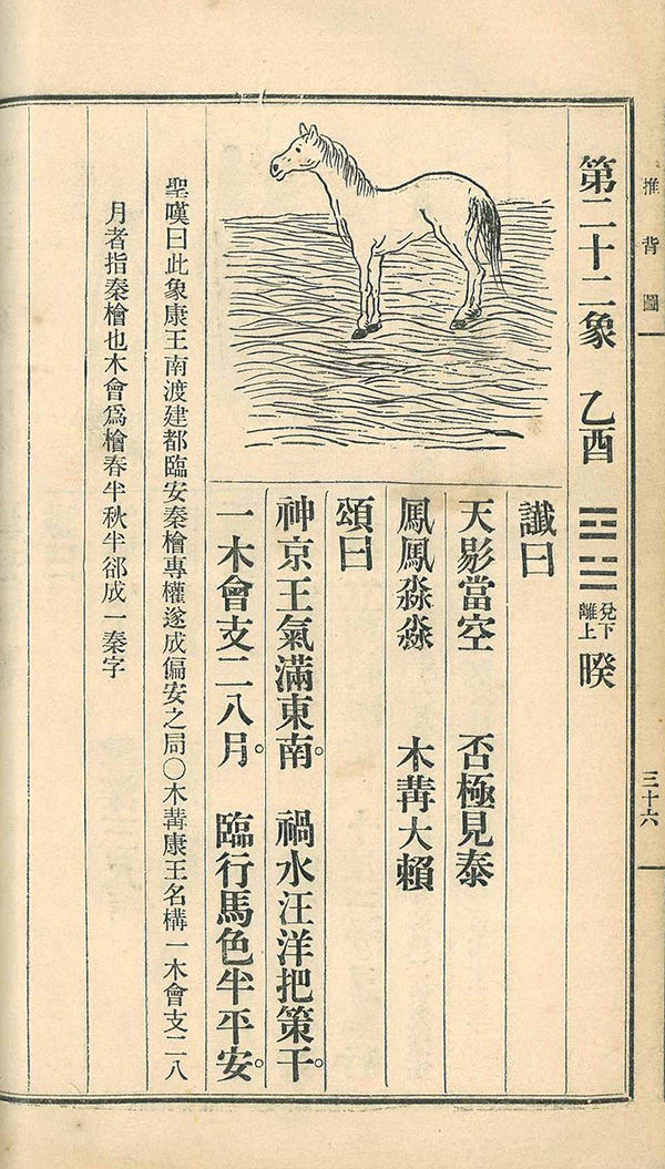 图中的水,与颂中的祸水、谶中的淼淼对应;马与颂、谶中的马对应。但是,人们看图时,联想最多的还是“泥马渡康王”的传说。