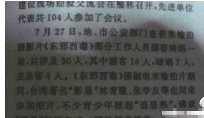 先来说一下《东邪西毒》剧组集体嫖娼案件。据陕北榆林市志1993年记载,由王家卫执导的《东邪西毒》剧组成员在拍摄期间集体嫖娼被公安机关抓获,涉案人数高达30人,嫖客16人,暗娼7人,皮条客4人,相关人员均被罚款且接受警示教育。