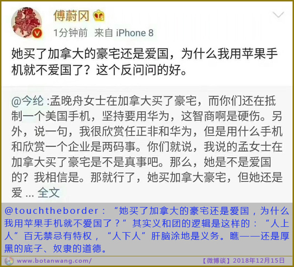 她买了加拿大的豪宅还是爱国,为什么我用苹果手机就不爱国了? 中国记忆 15 12 月, 2018 热推 @touchtheborder:“她买了加拿大的豪宅还是爱国,为什么我用苹果手机就不爱国了?”其实义和团的逻辑是这样的:“人上人”百无禁忌有特权,“人下人”肝脑涂地是义务。瞧——还是厚黑的底子、奴隶的道德。 本文内容除特别注明外均取自各新闻媒体(本站底部列表)和youtuber twitter(x),chatgpt, gemini, 并不代表本站立场! 评论不允许人身攻击。 Posted in 热推, 荒唐世界Tagged 加拿大豪宅, 爱国, 苹果手机Related Posts 中国女生注意!他们要开始耍流氓了 中共红卫兵猖獗斗争假洋鬼子,机会主义者白眼狼饶毅们自食苦果 中国禁止境内乌克兰人发表爱国言论, 乌领事馆呼吁停止 崔天凯大放厥词,说中共等于中国人 – 网友网上骂翻天 中共国已经实现了习近平的中国梦 – 年轻人如此爱国 董卿式爱国 谎言里开不出生命之花 啥叫爱锅 ? 老子脚趾头都比那些小粉红爱國 !
