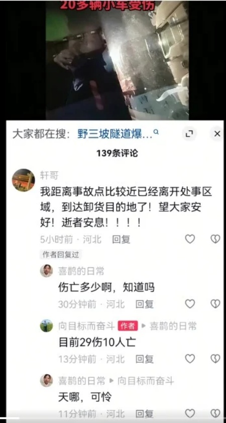 从网友发布的视频显示,爆炸发生时,隧道内火光冲天,浓烟滚滚。爆炸后,隧道内一片狼藉,满地车辆残骸,多达20多辆车严重毁损,惨不忍睹。有些车辆已经被炸得支离破碎,车辆里面的人员状况让人堪忧。