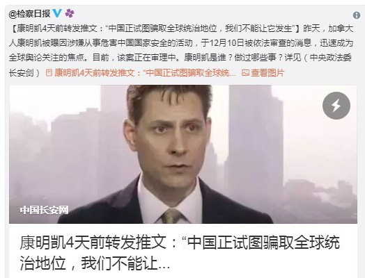 华为首席财务官孟晚舟12月1日在温哥华被捕后,中共威胁说要加拿大释放孟,否则将会“面临严重后果”。上周,中共国安以涉嫌危害中国国家安全为由拘留了加拿大前外交官、国际危机组织成员康明凯,以及加拿大商人斯巴沃(Michael Spavor)。加国驻华大使麦家廉上周五(12月14日)和上周日分别探望了康明凯和斯巴沃。