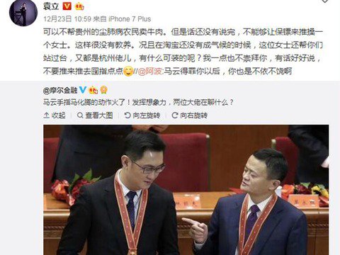 北京时间12月23日,袁立在个人微博里公开指责马云:“可以不帮贵州的尘肺病农民卖牛肉。但是话还没有说完,不能够让保镖来推搡一个女士。