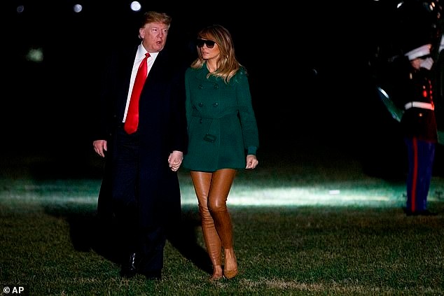第一夫人周四选择穿着一件绿色双排扣的Prada外套,牵着丈夫川普的手走过南草坪停机坪一同步入白宫。她在去年12月前往华盛顿军事联合基地参加活动时也曾穿着这件价值2480美元的外套。