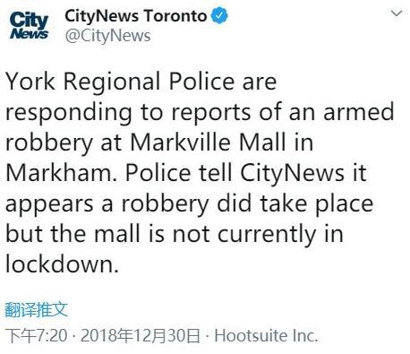 本地英文媒体City News也及时发出了六福珠宝店遭抢劫消息: