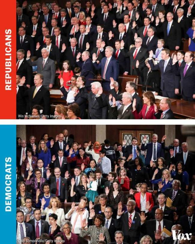 “民主党人和共和党人对比鲜明”美国vox网站3日在社交媒体上这样说道,配图就是这张第116届美国国会成员宣誓照片,该图上面是共和党人,下面是民主党人,宣誓时间为当地时间1月3日。
