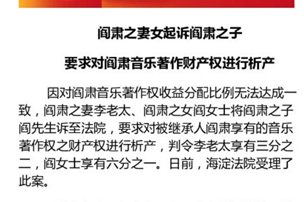 1月7日,北京海淀法院发布消息称,因对著名词作家阎肃音乐著作权收益分配比例无法达成一致,阎肃之妻李女士和阎肃之女阎女士将阎肃之子阎先生诉至法院,要求对被继承人阎肃享有的音乐著作权之财产权进行析产。