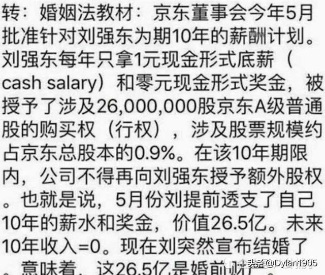 据网友爆料,刘强东早在结婚之前就跟奶茶妹妹签订了婚前合同。刘强东向京东预支了10年的工资,之后的十年之内,京东每年只给刘强东发一块钱。