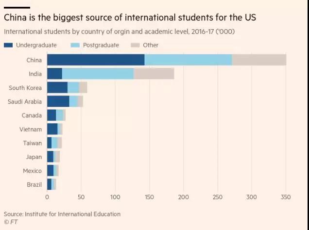 知情人士表示,即便美国内部也有很多美国人对这项举措非常的反对,因为“拒绝外国学生将对美国经济造成巨大破坏。”国际学生去年为美国带来了369亿美元的收益,45万份就业岗位。光中国留学生做出的贡献就占了30%。中国也因此成为美国国籍留学生最大的来源: