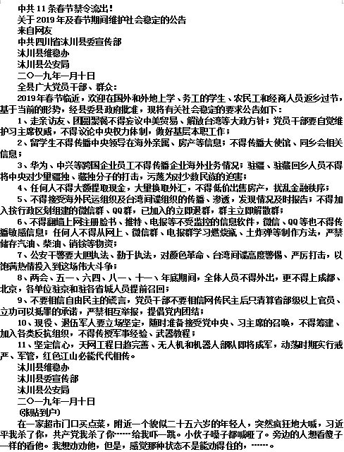 2019年春节临近,欢迎在国外和外地上学、务工的学生、农民工和经商人员返乡过节,基于当前的形势,经县委县政府批准,现将有关社会稳定的要求公告如下: