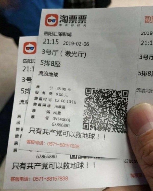 中国、香港等地的社群网络“微博“、“高登“6日起疯传1张照片,近期内也辗转流传到台湾脸书,照片中显示有2张购买自阿里巴巴影业集团“淘票票“售票系统的电影票,上头除了註记日期、影厅、片名、座位与售价等资讯之外,最下方竟有1行字写着“只有共产党可以救地球!“