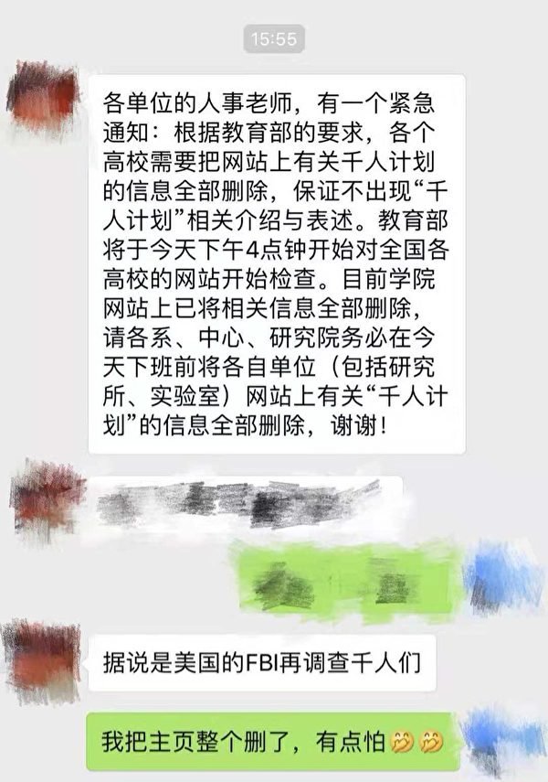 随着千人计划成为FBI对准的靶子,近日,网络上开始出现中共教育部要求删除“千人计划”相关信息的消息。有网友在推特上发帖说:“听朋友说学校开始删除某教授‘千人计划’所有有关的新闻……所以这是什么操作?”“千人计划是怎么回事……为什么国内大规模删除涉及千人计划4个字和相关人员名单的信息……?”