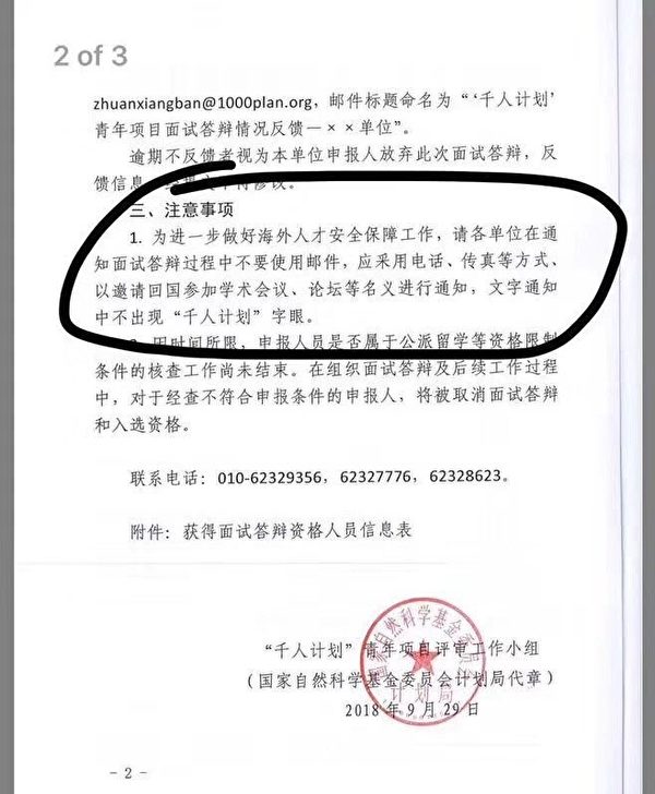 10月4日,网上出现一份署名“千人计划青年计划评审工作小组”回复某单位的信件截图,里面提到的注意事项特别强调,要“做好”海外人才的安全保障工作,要各单位在通知面试答辩时,不要使用邮件,而是采用电话、传真等方式。并且以回国参加学术会议、论坛等名义参加,文字通知中也不能出现“千人计划”字样。信件发出的日期是9月29日。