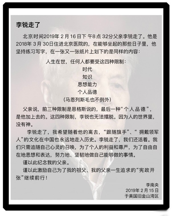 有报道称,中共十九大曾特邀李锐出席会议,被他以”脚痛”为由婉拒。但李锐写了一份书面发言,呼吁走全面开放改革之路,广开言路,让人民说话。 李南央是香港出版的《李锐口述往事》一书的作者,该书被北京视为敏感书籍。2013年10月,旅居美国的李南央返国探亲,行李中的数十本《李锐口述往事》遭海关查扣。李南央起诉北京海关,诉讼被延审十多次仍没有开庭。