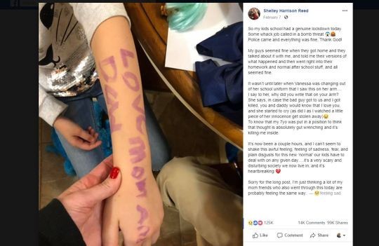 女儿回家时看上去状态还可以,不过里德之后发现,女儿用紫色马克笔在手臂上写下了“爱你们,妈妈和爸爸”。里德问女儿为什么要这样做,女儿回答说,“万一坏人进入学校、我死了,你和爸爸能知道,我爱你们……”随后母女二人相拥而泣。
