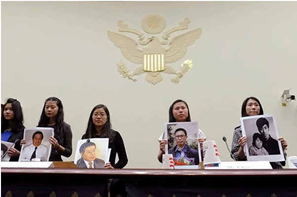 2013年12月15日,华盛顿国会山,在去众议院外交事务委员会听证会上作证前,王天安(中)举著父亲王炳章照片和其他几个女孩子一起呼吁北京当局释放她们的父亲。