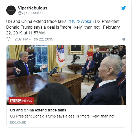 川普现场对中国国务院副总理刘鹤表示,“ 我把最后期限定在3月1日,现在是10%。我认为,如果你能把这一点告诉习主席,我认为如果我看到正在取得进展,正在取得实质性进展,延长这一最后期限不算不恰当——保持在10%而不是提高到25%。我倾向于这样做”。