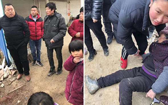 左图黑衣男子为乡副党委书记姜红伟,右图为被强拆户的母亲倒地。(村民提供)