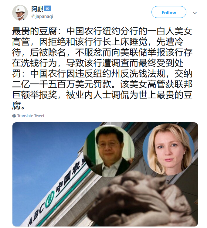 不服忿而向美联储举报该行存在洗钱行为,导致该行遭调查而最终受到处罚:中国农行因违反纽约州反洗钱法规,交纳二亿一千五百万美元罚款。该美女高管获联邦巨额举报奖,被业内人士调侃为世上最贵的豆腐。