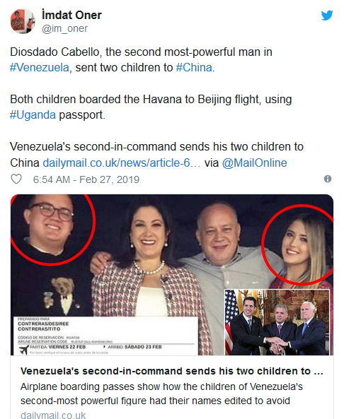 卡韦略是执政统一社会主义党副主席,被视为委国二号人物。他有3子女,而有报道指他22岁女儿丹妮拉(Daniella)和17岁儿子蒂托(Tito),上周五在古巴夏湾拿上机,在莫斯科转机,周日抵达北京,周一再转机到上海。社交网站流传疑是两人的登机证,二人疑用假名隐藏身份,姓氏变成孔特雷拉斯(Contreras),即他们母亲的姓氏。